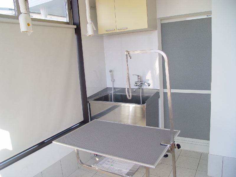 当校施設には大型犬専用のシャンプールームが設けられております。超大型犬(ピレニーズセントバーナード、アフガンハウンドなど)にも対応しております。